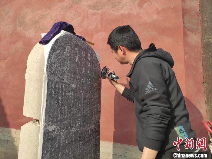 文保员罗亚飞正立于崇庆寺内石碑前拓印碑文。 张月 摄