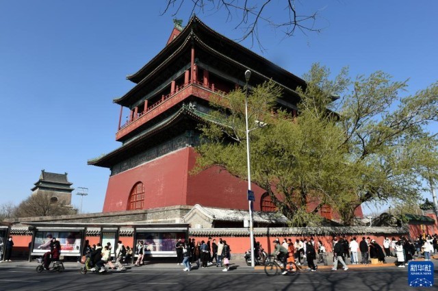 北京钟鼓楼(3月25日摄)。北京钟鼓楼始建于元至元九年(1272年),位于北京中轴线的北端。钟鼓楼里内设有计时仪器、定更之鼓、报时之钟,凭借高大的建筑形体和特殊的扩音构造,向当时的人们报送时间,充分展现了古人的智慧。