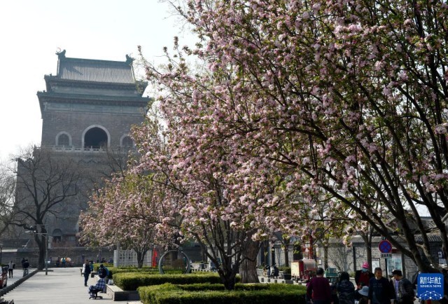 鲜花掩映下的北京钟楼(3月31日摄)。新华社记者 罗晓光 摄
