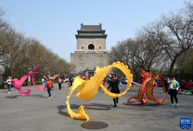 市民在北京钟楼前锻炼(3月30日摄)。新华社记者 罗晓光 摄