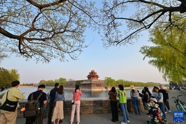 游客在故宫角楼拍照片(3月29日摄)。新华社记者 李鑫 摄
