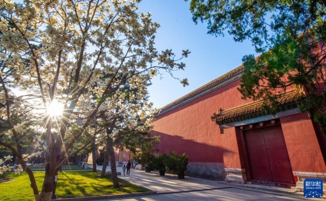 太庙一角玉兰花绽放(3月27日摄)。太庙始建于明永乐十八年(1420年),占地19.7万平方米的太庙是明清两代皇帝祭祀祖先的场所,是我国现存最完整、规模最宏大的皇家祭祖建筑群。新华社记者 陈钟昊 摄