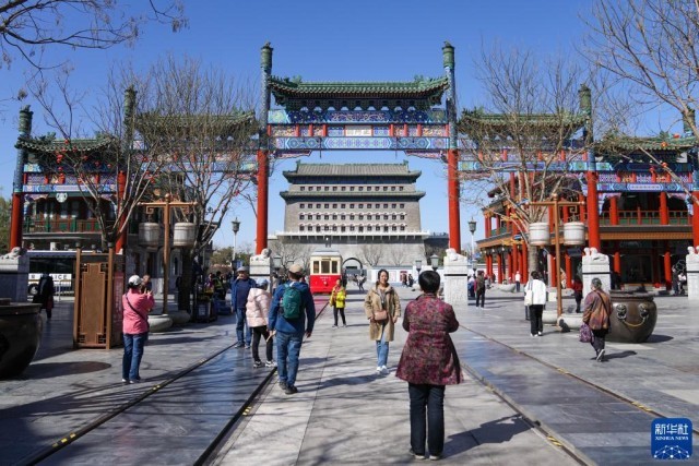 游客在正阳门南的前门大街参观游览(3月27日摄)。新华社记者 鞠焕宗 摄