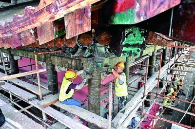 施工人员在河北正定古城南城门楼施工现场进行修缮作业。新华社发
