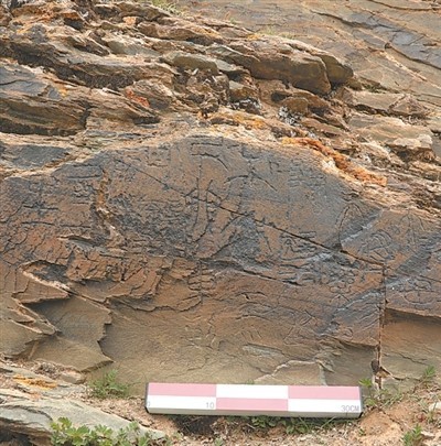 考古工作者在青海省扎陵湖畔拍摄的尕日塘秦刻石照片。