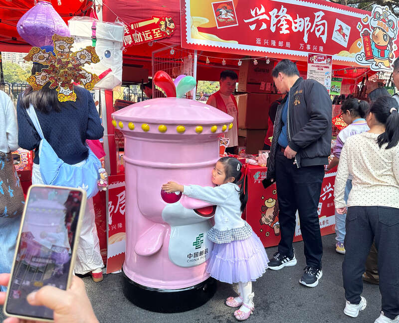 在2026年海珠滨江花市上,小朋友与“大湾鸡”主题邮筒合影。中青报·中青网记者 林洁/摄