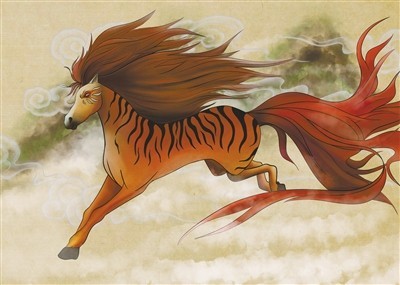 除了长寿,子嗣兴旺也是古人追求的终极所在。鹿蜀就是多子多福的代言“马”。鹿蜀生活在杻阳山,它的样子同样奇特:形如白马,却长着老虎般的斑纹,还拖着一条红色的尾巴,叫声像人在唱歌。《山海经》中说它“佩之宜子孙”,也就是说,佩戴它的皮毛,就能获得强大的繁衍能力,让家族人丁兴旺。