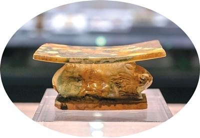 展厅里陈列着隋代萧窑白釉瓷杯、唐代寿州窑黑釉瓷枕、巩县窑绞胎瓷枕、青釉褐彩贴花瓷执壶等瓷器精品,吸引不少观众细细欣赏。唐三彩兔形枕2006年出土于宿州市西关运河遗址,构思巧妙,工艺细腻,施黄、绿、褐釉。枕面近长方形,两头上翘,枕面下有一只静卧的兔子,加以长方形底座。枕面方框内饰有两只飞鸟,辅以花朵、枝叶,给人安详雍容之感。岳珂介绍,早期的瓷枕为随葬明器,后发展为实用器。