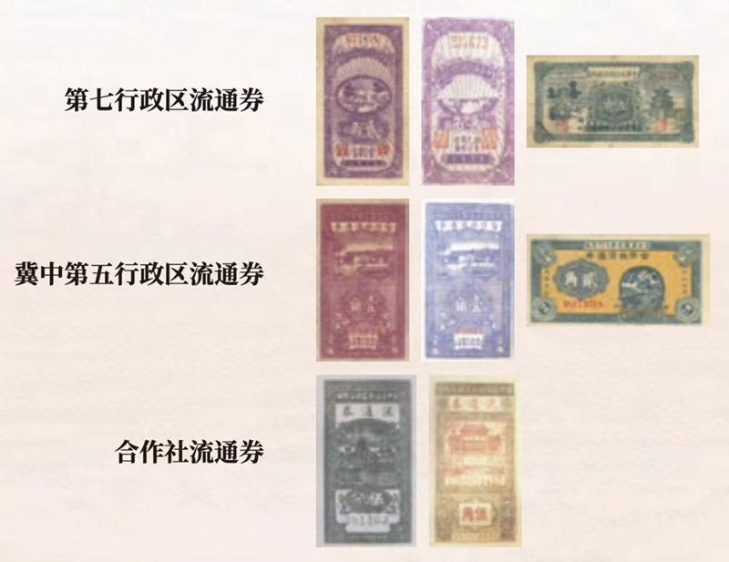 晋察冀边区第七行政区、冀中第五行政区、冀中各县、河北宝坻县以“合作社”“银钱局”或县的名义都发行过流通券。 据不完全统计,共有26个县发行过流通券,面值为伍分、壹角、贰角、伍角等几种。