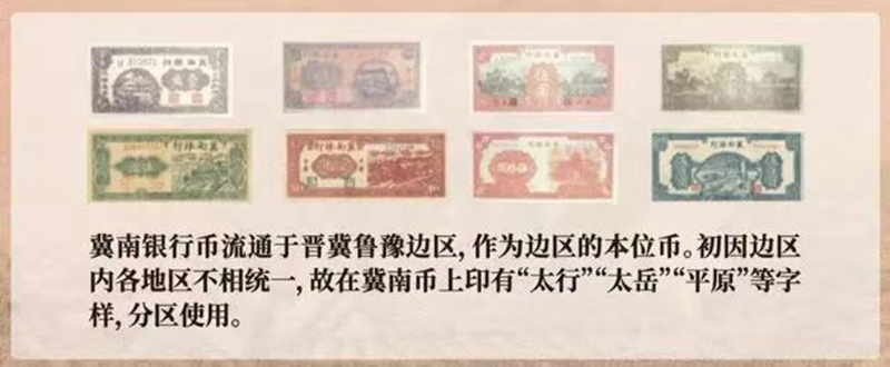 晋冀鲁豫根据地包括太行、太岳、冀鲁豫、冀南四个区。1937年10月,八路军一二九师进入太岳和太行山区,创立晋冀豫抗日根据地。1938年5月,一二九师主力进入冀南,建立冀南抗日根据地。1939年2月,八路军一一五师一部进入冀鲁豫地区,与地方党组织建立冀鲁豫、鲁西、湖(微山湖)西三个抗日根据地。为了冲破日寇的经济封锁,中共中央北方局和冀南区行政主任公署于1939年9月在晋冀鲁豫边区组建自己的金融机构—冀南银行,10月15日,冀南银行在山西省黎城县小寨村正式成立,发行根据地本位币冀钞,以统一全区货币,保障供给,发展经济。