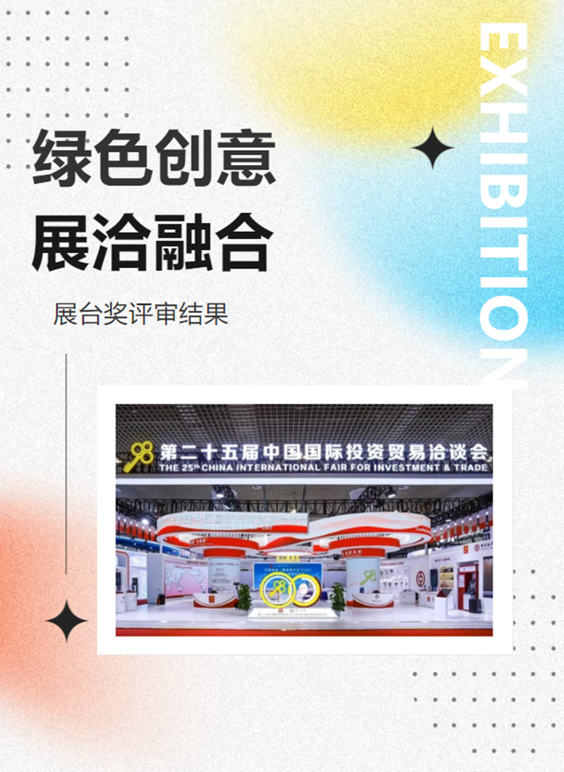 9月8日-11日,第二十五届中国国际投资贸易洽谈会在福建厦门举行,超过120个国家和地区的代表团参会。为深入践行国家绿色发展战略,鼓励创意创新展示思路,进一步深化展洽融合模式,全方位提升参展单位的积极进取发展水平,投洽会组委会会务部于第二十五届投洽会期间举办了“绿色创意展洽融合展台奖”评选活动。经专家评审小组结合观摩3D效果图及现场实地评估,按照评奖方案和评分标准,于9月27日面向社会公布了评选结果。