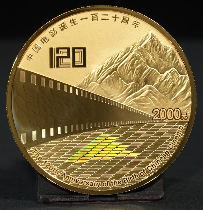 数字微镜及流媒体播放器符号采用的则是近年来中国贵金属币上成熟运用的光变鳞彩工艺,象征数字技术为电影注入的无限可能。光变鳞彩工艺的特色在于,采用这一工艺的金属表面初看和周围颜色相同,但随着光线流转,就会隐现五彩斑斓的颜色。它与胶片的质朴质感形成鲜明对比,生动诠释了“传承与创新”的设计主题。