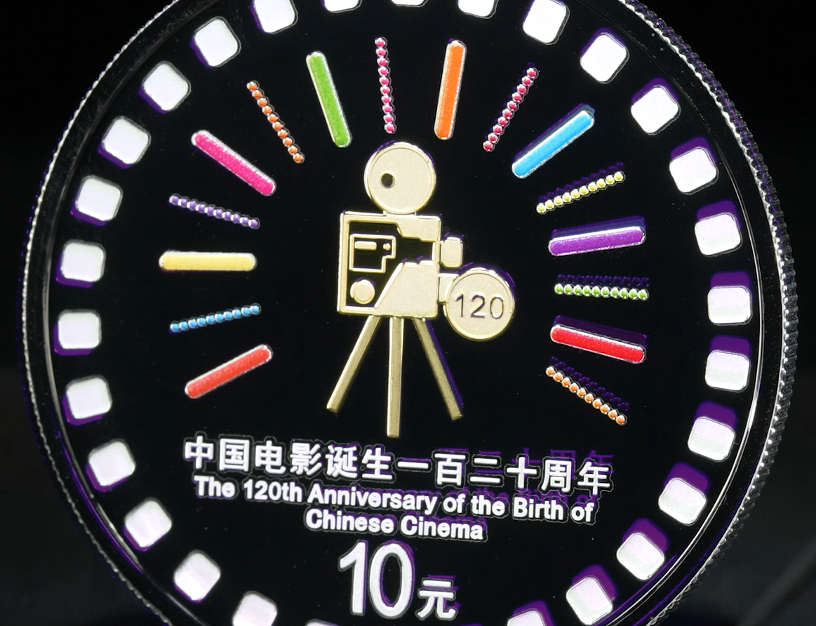 完美的设计离不开对之匹配的尖端铸币工艺支撑。该枚银质纪念币背面采用镀黑底面,颇具巧思。它不仅很好地衬托出主体图案的鲜明,更重要的是,营造了一种纯粹的、仪式感的观影环境,让观者仿佛置身于影院之中,静待着一段精彩的光影故事。在此基底上,局部镀金的放映机成为视觉锚点。彩喷和荧光油墨印刷工艺应用于光束上,带来了更新奇的观赏体验。在正常光线下,这些光束呈现出丰富的色彩,灵动而现代。当处于紫色荧光照射下,它们瞬间迸发出鲜艳的荧光。这一工艺设计,堪称神来之笔。币面文字和面额经喷砂处理,呈现出细腻的磨砂质感,在其上方,金色的“120”闪闪发光,它被有机融入放映机与光束中,诉说着中国电影走过的120年峥嵘岁月,也预示着其无限美好的未来。