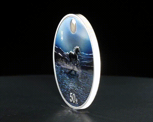 贵金属本身就是创作载体,如同国画中的纸和笔、油画中的颜料与画布。既然使用金、银、铂,就要展现其特殊的金属美感,让材质本身“说话”。我从浮雕制作介入纪念币流程,后转向前端设计,因此设计图稿时会用逆向研发思维,充分考虑工艺对设计的影响。例如,当我想表达马的空灵感时,会计划用大量天空元素,在金属工艺运用中便想到用镜面来表现天空。即便后续叠加彩喷工艺,我也会着意让彩喷透出底下的镜面质感,确保观者拿到实物时,能清晰感受到金属载体与纸质载体创作的截然不同,让材质和工艺为艺术表现力加分。