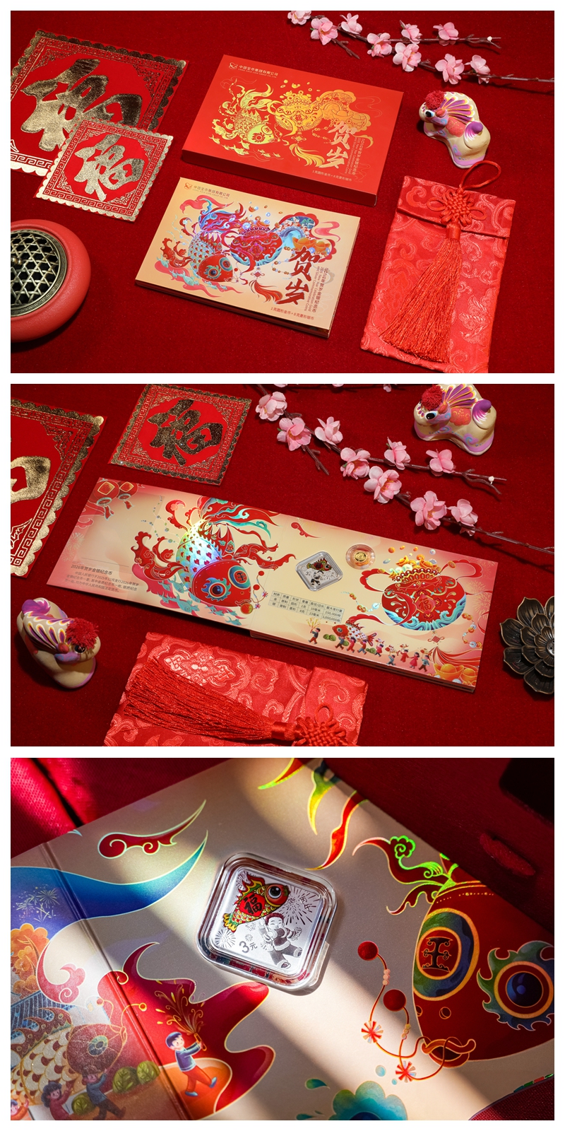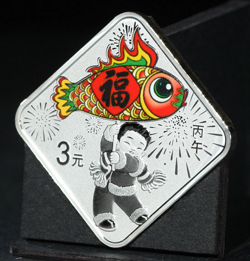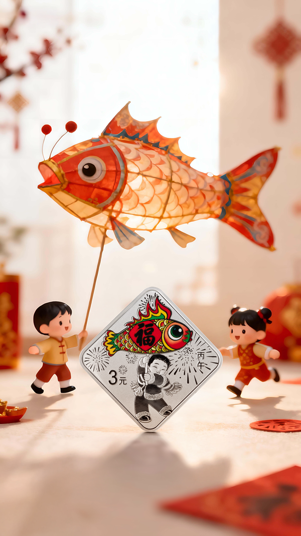 8克菱形银币背面生动呈现了舞鱼灯场景,以鱼灯游弋、流光溢彩的画面,既展现贺岁佳节欢庆盛况,亦传递出人民对年年有余、富足安康的真挚祈愿。
