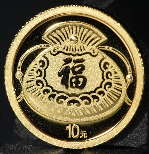 1克圆形金币背面的主图案福袋造型,采用多层次激光喷砂工艺,不仅清晰呈现出福袋饱满立体的体量感,更细腻地塑造出其丰富多元的层次质感,有效烘托出贺岁主题的厚重与精致氛围。