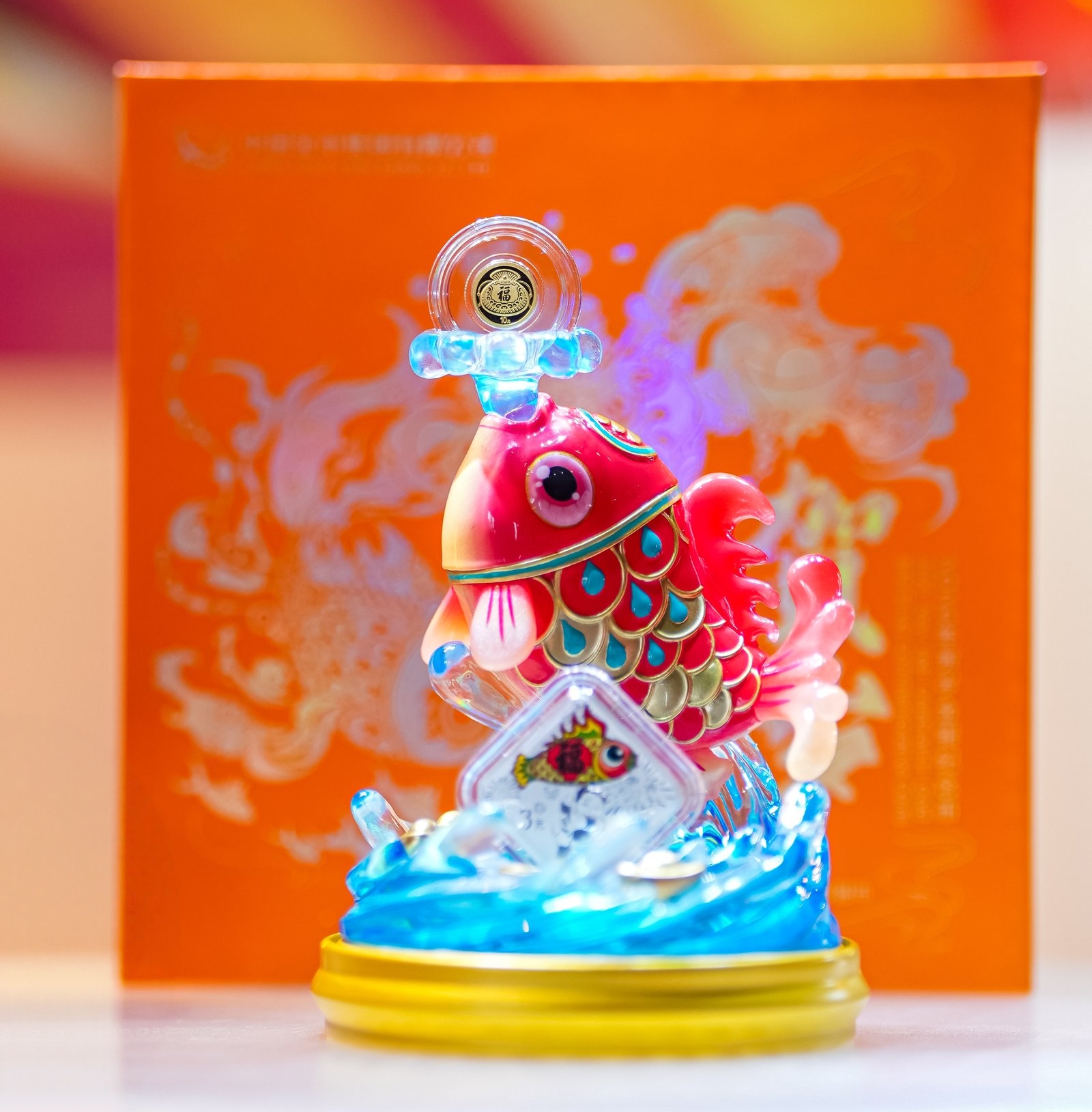 金银套文创包装是鲤鱼手办,在聚宝盆底座上是旋转向上聚拢的水浪,其上腾跃起一尾红鲤,它口吐水花托起明珠一样的金币,身侧一枚银币破浪而出。浪花晶莹剔透,鲤鱼鱼身陶瓷质感,红亮喜人,鱼鳍鱼尾渐变透明,尽显灵动质感。整个浪花托着红鲤鱼可整体在聚宝盆上旋转,寓意风生水起,聚风聚水聚财,转运转(赚)钱转(赚)福。