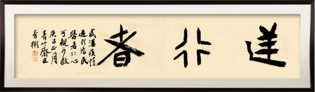疫情就是命令,防控就是责任。众多医护人员战斗在党和人民最需要的地方,他们同时间赛跑,与病魔较量。其中有始终站在临床一线的钟南山、李兰娟、乔杰、王辰等院士,有大声喊出“我是党员,我先上;我是党员,我带头!”的上海华山医院感染科主任张文宏,更有媒体记者、建筑工人、环卫工人等默默无闻的一线工作者。他们是忠诚卫士,更是人民英雄。李彬为这些伟大的逆行者感动,创作了《武汉加油》《众志成城》《逆行者》《医德为尊》《大爱无疆》等书法作品,讴歌广大医护人员和所有战斗在一线的最美中国人。