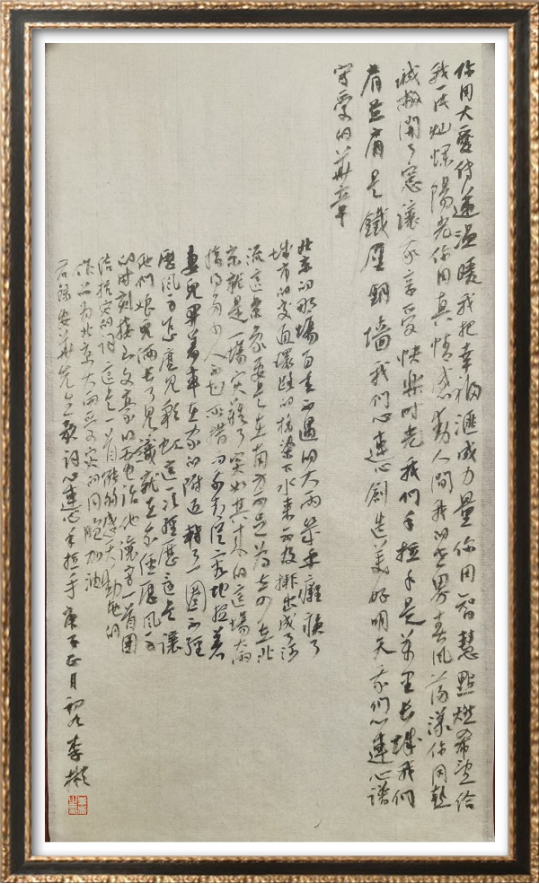 “坚定信心,同舟共济,科学防治,精准施策”的16字疫情防控工作总要求坚定了人们打赢疫情防控阻击战的信心,李彬挥笔写下行书《心连心手拉手》,用安华先生歌词“我们手拉手是万里长城/我们肩并肩是铁壁铜墙/我们心连心创造美好明天/我们心连心谱写爱的华章”,表现全国人民团结一心,同舟共济,共抗疫情的决心。