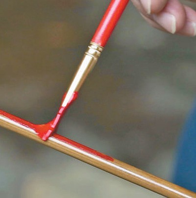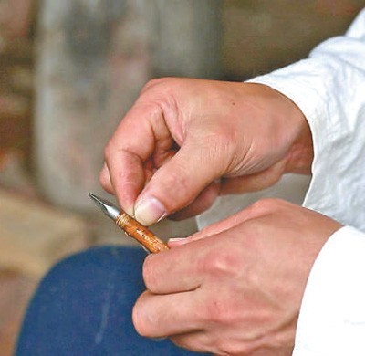 制弓时,先将竹子置于炭火上进行炭化,破成一寸宽的竹片后整直,再细细刨去竹黄,留下强韧的竹青层作为弓体。“弓体由两张竹片黏合而成,刨制时必须处理好两者的张力。”为此,张召羽要根据竹片的特性反复调试其性能状态。此后,刮花竹黄面,用调制好的鱼鳔胶涂在竹木片刮花的一面,黏合竹片,并缠上走绳加固定型,再经过修整弓弰、打磨弓弝、涂漆、上弦等工序,最终完成弓的制作。