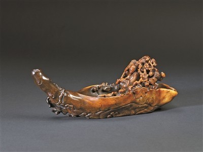 犀角器是一种很难在心中留下挥之不去印象的器物,也许是因为它的颜色太暗沉了。玉器、瓷器、牙器多是冰清玉洁、温婉动人,即便是墨色的漆器,也常与金箔、贝母一起,幻化出流光溢彩的美感。唯有犀角器,默默地被冷落一旁。然而,它以独有的色泽和纹理、精湛的雕刻、随形的创意、极富画意的主题,将美丽悄悄绽放在懂它的人眼里。