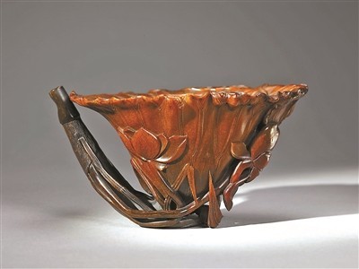 以莲喻清廉高洁,是中华民族的悠久传统。明代永乐、宣德时期的青花瓷已盛行“一把莲”纹样,至明后期,这一意象更被融入犀角雕刻中。“一把莲”荷叶杯实在太美了,大大的莲叶,或向上舒展,或向下倒卷,宛若佛造像仰覆莲座设计。荷梗中空,与嫩叶、莲花缠绕,其中一茎连通杯心,既是杯柄,又是吸管。雕饰极尽精微,叶脉分明、花蕊纤毫毕现。