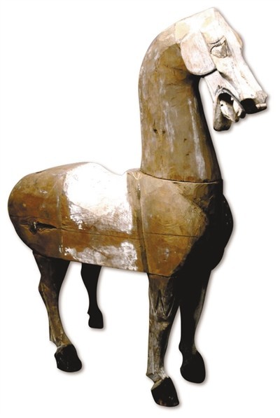 河西出土的木马俑,按照当时良马的标准雕刻,马头方直高峻显出力量感,马眼突出意味着心脏的强劲,鼻孔阔大代表肺活量大,耳小而尖是易于驾驭的象征,前腿部两块鼓起的肌肉喻示速度惊人,而平直的背部则利于平稳负重。通过这些超越现实层面的艺术雕塑手法,彰显出马与众不同的地位。