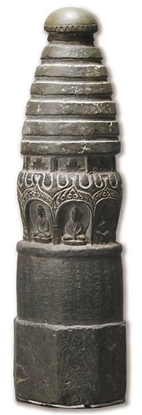 其中又以佛教石窟寺文化最为兴盛。展览先以一幅醒目的《河西走廊主要石窟分布示意图》标明所有遗址的大致方位,又以壁画残片和石塔等文物加以具体呈现。北凉石塔是佛教初传中土时,新疆、河西走廊一带信徒广泛使用的一种供奉小塔,为中国现存最早的石塔实物。其基本形态为八面体塔基,以阴线刻护法神王、八卦及发愿文,塔腹常刻《增一阿含经》,塔肩作覆钵状,雕七佛与弥勒像,塔顶置多重相轮。北凉石塔见证了外来佛教与中华文化融合、共存与发展的历程。