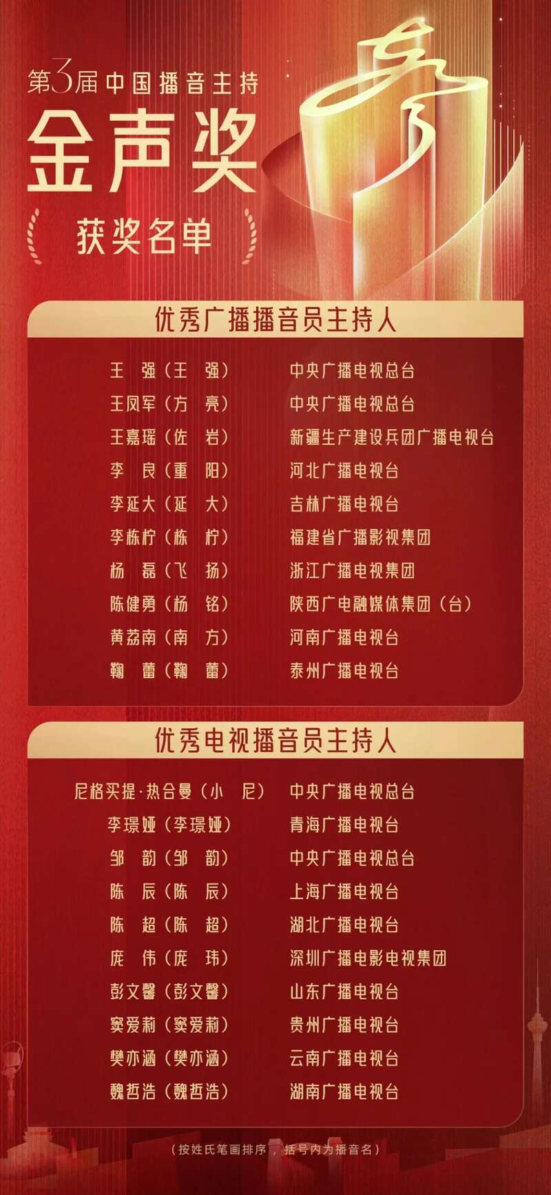 中国电视艺术委员会党委书记、秘书长易凯介绍,中国播音主持“金声奖”于2021年经中央批准设立,由国家广播电视总局主办、中国电视艺术委员会承办,是我国播音主持领域首次设立的国家级政府奖。本届“金声奖”评选出优秀广播播音员主持人、优秀电视播音员主持人各10名。