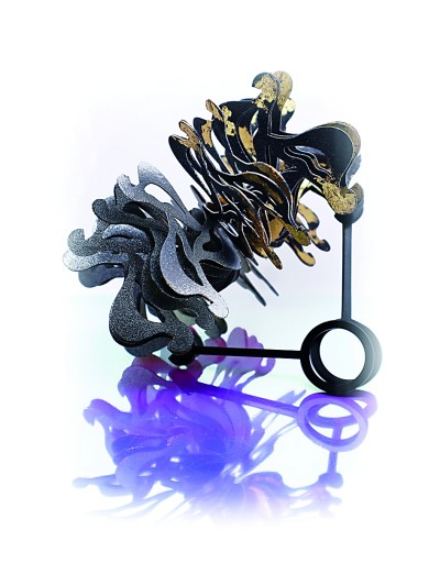 设计师马宇婷的作品“疤痕的成就”是以胸针、吊坠为主的系列首饰,体现了多种材料与工艺的巧妙融合。创作者首先运用数字建模技术构建出首饰主体的空间结构,调节好尺寸和细节后,再使用3D打印技术制作金属及树脂胎体。待修型步骤完成后,即可对局部金属胎体施以珐琅工艺,树脂胎体的髹饰则采用多种传统漆艺,如变涂、莳绘、蛋壳镶嵌等,最后再整体打磨及局部修补,直至将各个部件安装组合为成品胸针和吊坠。该系列作品利用不同材料的丰富质感,在方寸间描绘出雨后山林、大漠孤烟、海上黎明等自然景致,力求彰显北宋官窑釉色的风雅之美,最终幻化为集艺术性与实用性于一身的当代大漆首饰作品。