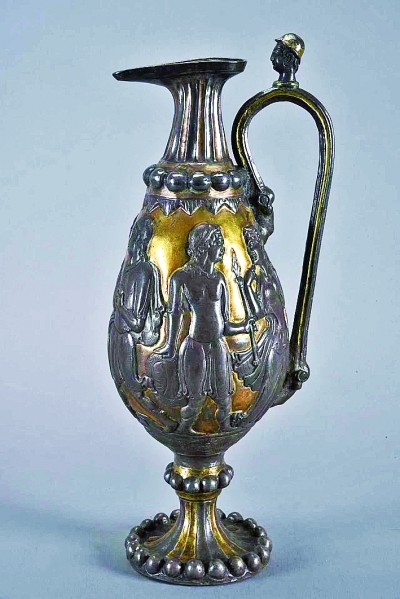 这种鸭嘴状流、环形单柄、细长颈的壶,古代又称“胡瓶”,多由西亚、中亚传入中原,一般用作贵族酒器。仔细端详,不仅壶身浮雕透着浓浓的异域风情,其制造工艺也颇具“国际范”。据专家研究,鎏金银壶制造地为中亚巴克特里亚地区(今阿富汗北部地区)。它具有非常典型的波斯萨珊金银器特点:壶颈、环形把及底座的凹槽柱式纹样,源于希腊建筑中凹槽形式的柱子;颈部、底座几处凸起的联珠纹装饰,在丝路钱币及纺织品上多有出现。其制作融合了锤揲、焊接、雕刻等工艺,体现了萨珊金银器的顶尖水平。