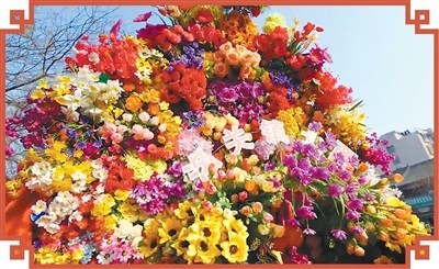 河北邯郸“永年抬花桌”技艺表演中,花桌上,花团锦簇,喜庆满满。资料图片