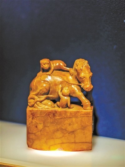 东汉画像石中也有类似形象:骏马旁的柱子上攀援着一只猴子。明清时期大量出现的拴马桩柱头上雕刻猴子,正是它作为牲畜健康保护神观念的延续。这也解释了唐三彩骆驼的背上为什么会趴着猴子。当然,由于“猴”与“侯”谐音,与马组合成“马上封侯”的吉祥图景,成为激励士子、祝福前程的经典图式。国家博物馆此次就展出了一枚清代寿山石雕“马上封侯”章。