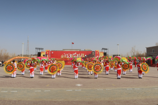 九连、七连、六连、同心社区等队伍依次登场,或秧歌欢腾,或彩绸飞舞,或龙狮共舞,或高跷稳健。三连的“龙腾瑞狮迎春队”将卡通形象融入传统表演,逗得孩子们哈哈大笑。五连的返乡大学生与居民共同演绎舞蹈《永远跟党走》,用青春舞步表达对党的感恩。八连的《中华全家福》舞出了大家庭的温暖,四连的四大方阵气势恢宏。一连作为老牌强队,以精湛的高跷技艺和精妙的编排赢得掌声雷动。十连的80名队员盛装亮相,用欢快舞姿祝愿五谷丰登。压轴出场的二连社火队更是将农用机、旱船、竹马、彩扇、秧歌等元素悉数呈现,金龙昂首、瑞狮抖擞,把最浓的年味和最深的祝福洒满全场。