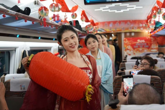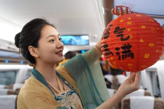 车厢内喜庆的节日装饰暖意浓浓。乘务人员为旅客表演相声、舞蹈等文艺节目,与旅客互动猜灯谜、做花灯、吃元宵,车厢里满是欢笑与温情。