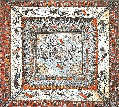围绕着莲花的是四身执花飞天,在蓝天的映衬下,长巾飘举,遨游曼舞,周围浮云流动,似有风在吹拂。井心以外有卷草纹、联珠纹、垂角纹、帷幄等,颜色有淡红、深红、赭石、黄、白、绿、黑等,色彩丰富并且描绘细致。最外层是一组伎乐飞天,他们手握琵琶、箜篌、腰鼓等,淡黄的底色,与内层的蓝色相呼应,气氛热烈欢快。