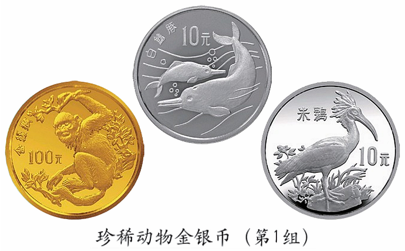1988-1997年,中国人民银行先后发行了5组珍稀动物金银币,共17枚。其中,1988年珍稀动物金银币(第1组)中,“金丝猴”8克金币展现了身材肥壮、皮毛茂密的成年雄性金丝猴在山野间自由欢乐的生活场景。它们由古猿进化而来,与人类一同跨过了漫长的历史长河,却难以逃脱现代社会带来的毁灭性灾难,成为珍稀物种。“白鳍豚”27克银币刻画了两尾在水中嬉戏的白鳍豚。白鳍豚是“水中活化石”,有重要的学术研究价值,被称为“长江中的大熊猫”。真心期望在未来的某一天,长江中能再现这样温馨的画面。“朱鹮”27克银币上,朱鹮静静站立在湿地边的浅水区,目光穿过薄雾,投向远方,仿佛在进行一场无声的对话。朱鹮是国家一级保护野生动物,被誉为“东方宝石”。